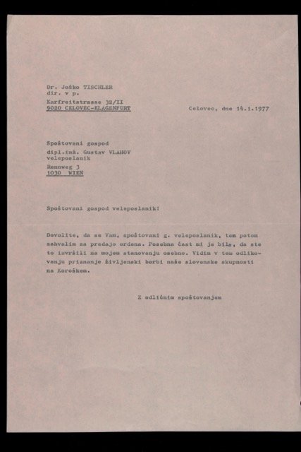 Der scheidende jugoslawische Botschafter Gustav Vlahov überreichte anlässlich seines Abschiedsbesuches am 8. Jänner 1977 Joško Tischler einen hohen Orden – den Orden vom jugoslawischen Stern mit goldenem Kranz. Tischler hob bei dieser Gelegenheit besonders die Gründung des Slowenischen Gymnasiums hervor, war er doch „überzeugt, dass die Jugend die Trägerin der Idee des friedlichen Zusammenlebens und des gegenseitigen Verständnisses beider Nachbarstaaten sein wird“. Die Antwort an den Botschafter beendete er mit der vorsichtigen Ansage, dass das Ziel seiner politischen Anstrengungen irgendeinmal doch erreicht werden würde: „Dieser Weg wird jedoch noch lang und dornig sein und ich bin überzeugt, dass wir die Erfolge weder heute noch morgen erleben werden, aber wir werden sie erleben.“