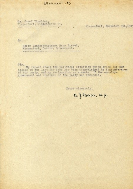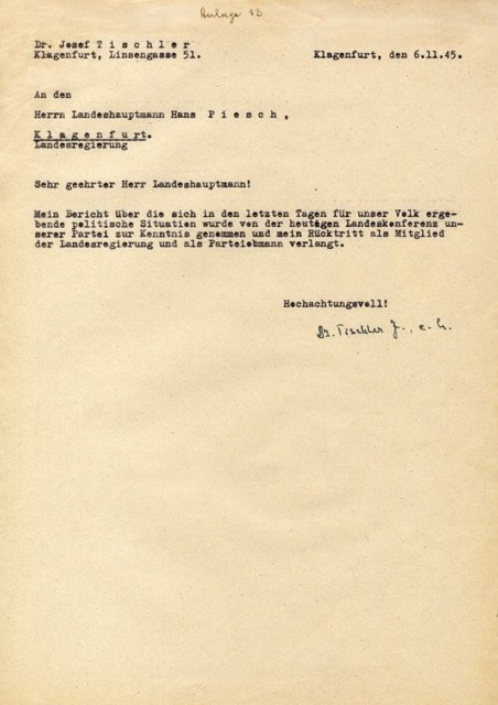 Tischlerjeva odstopna izjava, naslovljena na deželnega glavarja Piescha /Tischlers Rücktrittserklärung, adressiert an den Landeshauptmann Piesch, 6. 11. 1945.