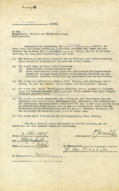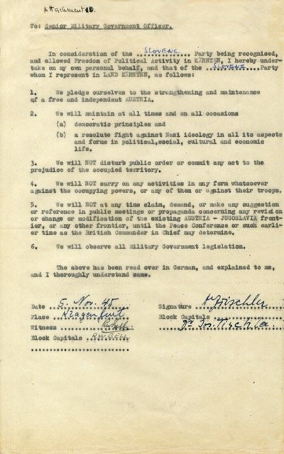 Lojalnostna izjava, s katero so britanske oblasti pogojevale dovoljenje za ustanovitev Slovenske stranke in njen nastop na volitvah / Loyalitätserklärung, von der die britischen Behörden die Erlaubnis zur Gründung der Slowenischen Partei und ihr Antreten bei der Wahl abhängig machten; Tischlerjev podpis/Tischlers Unterschrift 5. 11. 1945. (ADT/ZRC SAZU) (ADT/ZRC SAZU)