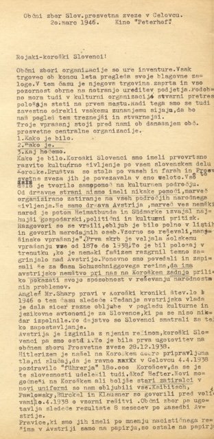 Tischlerjev govor na občnem zboru Slovenske prosvetne zveze / Tischlers Rede in der Hauptversammlung des Slowenischen Kulturverbandes, 20. 3. 1946. (ADT/ZRC SAZU)