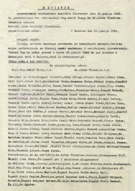 Die endgültige Entscheidung, eine neue politische Organisation zu gründen, die auf den Grundlagen der Kärntner slowenischen Partei aus der Zeit vor dem Weltkrieg fußen sollte, fasste Tischler nach dem Treffen der Außenminister der Großmächte in Paris, wo sie am 16. Juni 1949 entschieden, dass die vor dem Anschluss bestehenden Grenzen Österreichs unverändert bleiben. Eine gute Woche später, am 28. Juni, wurde die erste Hauptversammlung der neuen politischen Organisation – des Rates der Kärntner Slowenen – einberufen. Bei der Besprechung sagte Tischler – die berühmten und mehrmals zitierten Worte – „dass das Schicksal der Kärntner Slowenen wieder ihnen selbst in die Hände gegeben worden ist“. Tischler fasste später die Hauptbeweggründe für die Gründung einer neuen Organisation in der folgenden Erklärung zusammen: „Wir wollten die neue Realität anerkennen sowie betonen, dass wir Teil des slowenischen Volkes sind und dass wir die Politik in Kärnten auf jenen Grundlagen bauen wollen, auf welchen die Politik in Kärnten vor dem Kriege gewachsen ist.“