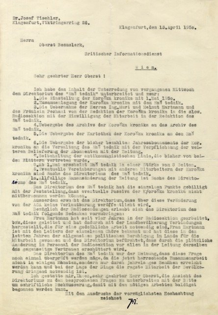 Po sporu z Informbirojem je postalo jasno, da je Jugoslavija tudi glede koroškega vprašanja ostala brez podpore Sovjetske zveze. Nasprotja med Stalinom in zahodnimi velesilami so bila takrat že očitna, a to še ni pomenilo tudi, da lahko koroški Slovenci sedaj računajo na britansko razumevanje. Tischler je vseeno poskušal reševati, kar se je rešiti dalo. Njegova protikomunistična drža mu gotovo ni škodila v odnosih z britansko zasedbeno oblastjo, ki je bila vendarle na določenih področjih pripravljena podpreti njegova prizadevanja. To se je pokazalo pri pobudi pomladi 1950, da se glasilo Narodnega sveta koroških Slovencev Naš tednik združi s Koroško kroniko.