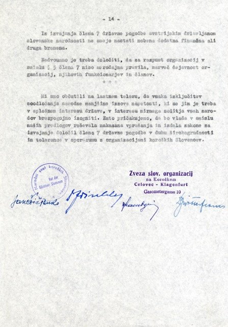 Na sprejem pogodbe sta se obe osrednji organizaciji koroških Slovencev odzvali enotno. V spomenici 11. oktobra 1955, ki je obsegala 14 strani, sta podali svojo razlago manjšinskih zaščitnih določil Avstrijske državne pogodbe. Spomenica je izhajala iz stališča, da so si koroški Slovenci pravice iz 7. člena pogodbe »priborili z neupogljivo voljo do obstoja, zlasti še v trdem odporu in uporu proti nacizmu na strani zavezniških sil in z ogromnimi žrtvami«. Njeni predstavniki so zagotovili, da si bodo prizadevali preprečevati nacionalne razprtije: »Pripravljeni smo, da tvorimo most, ki naj veže naroda-soseda in sosedni državi, kar bo nov in trden element miru v tem delu Evrope. Uspešno izvrševanje tega našega poslanstva pa zavisi tudi od dobre volje avstrijske države, ki mora priznati osnovno, prirodno pravico in težnjo vsake etnične skupine in vsakega naroda, da hoče živeti in kulturno ter gospodarsko napredovati.« V nadaljevanju je bilo v spomenici podrobno pojasnjeno, kako si predstavniki obeh osrednjih organizacij predstavljajo izpolnjevanje 7. člena pogodbe. Glavna pozornost je bila posvečena zagotavljanju enakopravnosti na šolskem, kulturnem, upravnem in sodnem področju. Izražena je bila tudi zahteva po ustanovitvi dveh posebnih narodnostnih referatov z višjima uradnikoma na čelu, od katerih bi eden deloval pri uradu zveznega kanclerja, drugi pa pri uradu koroške deželne vlade. Sklepna zahteva spomenice pa je bila sprejem posebnega zakona: »Vsa ta določila v zaščito narodnostnega značaja in narodnostnih pravic naj bi končno postala vsebina posebnega manjšinskega zakona, ki naj preko ustavno zajamčene individualne enakopravnosti državljanov slovenske narodnosti uresniči enakopravnost slovenske narodne manjšine kot celote in upošteva našo zahtevo, da hočemo koroški Slovenci živeti kot enakopravni med enakopravnimi.«
