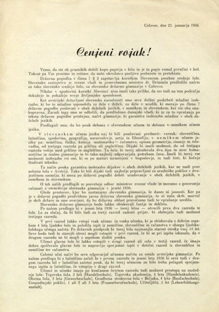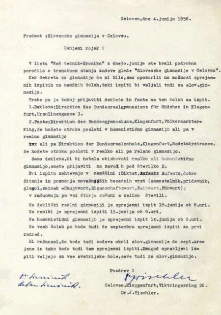 Tischlerjeva dopisa rojakom o ustanavljanju Slovenske gimnazije /Zwei Schreiben Tischlers an die Landsleute über die Gründung des Slowenischen Gymnasiums, 25. 1. in/und 4. 6. 1956. (ADT/ZRC SAZU)
