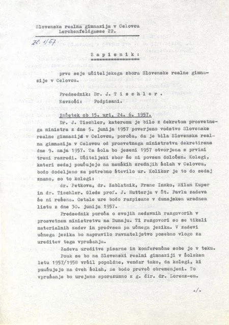 Zapisnik 1. seje učiteljskega zbora Slovenske realne gimnazije v Celovcu / Protokoll der 1. Sitzung des Lehrkörpers des Slowenischen Realgymnasiums in Klagenfurt, 24. 6. 1957. (ADT/ZRC SAZU)