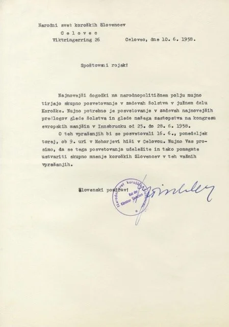 Tischlerjev dopis rojakom / Tischlers Schreiben an die Landsleute, 10. 6. 1958. (ADT/ZRC SAZU)