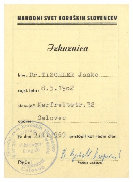 Tischlerjeva članska izkaznica v Narodnem svetu koroških Slovencev / Tischlers Mitgliedsausweis beim Rat der Kärntner Slowenen. (ADT/ZRC SAZU)